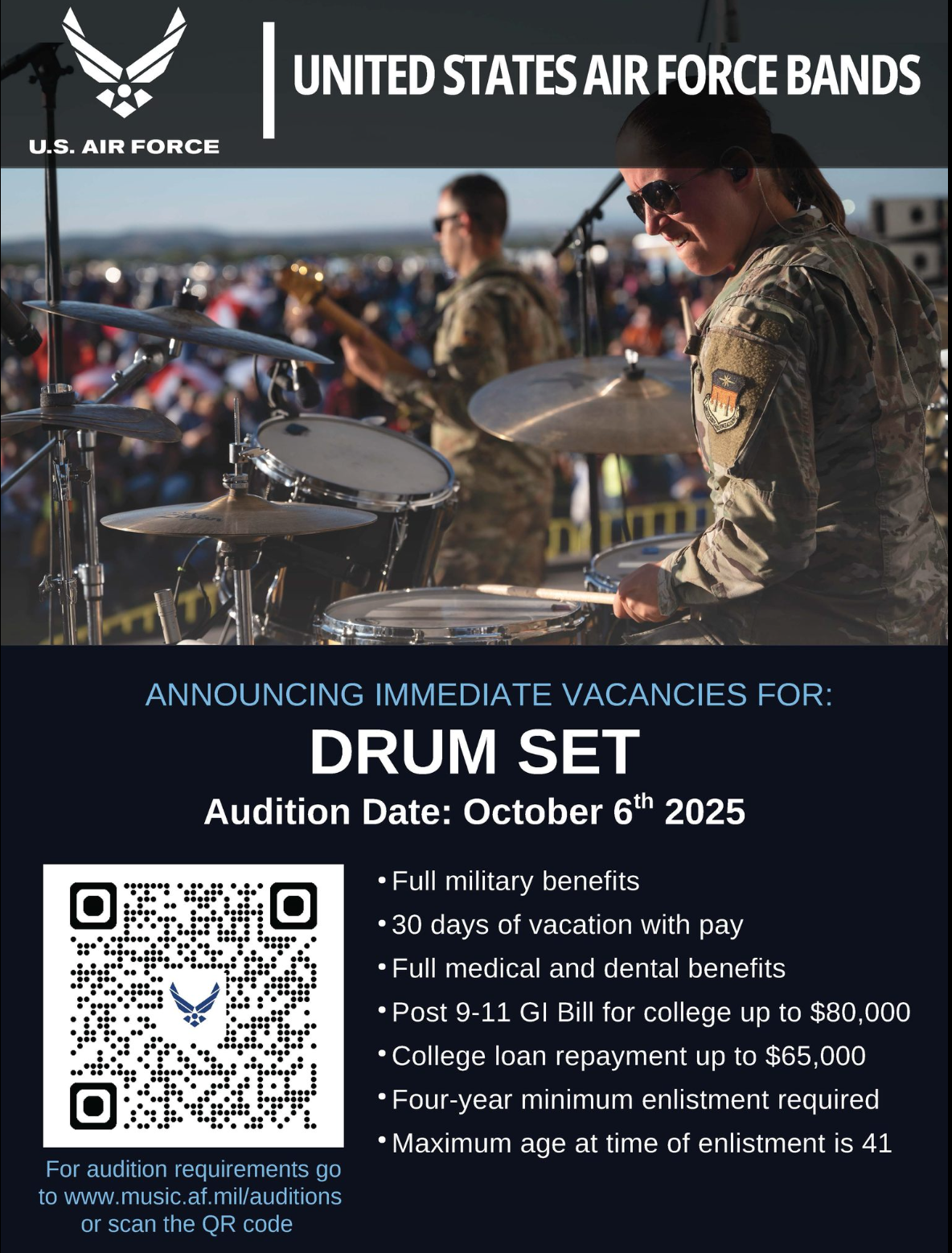 The Air Force has music openings and auditions coming up in San Antonio, TX. The drumset audtion is happening on Oct 6th and Pre-screen submissions for Guitar, Piano/Keyboard, Trumpet (Jazz), Drum Set and Audio Engineer are due August 11th.