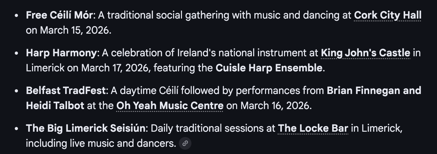 St. Paddy’s Day is happening next Tuesday and there are several places to celebrate. You can start with searching Eventbrite for things local to you. Here are some tips in general and for Dublin, Ireland. Here are some recommendations for Cork. Limerick has two options at King John’s Castle and also the Locke Bar. Northern Ireland also takes part with Belfast at the Oh Yeah Music Center.