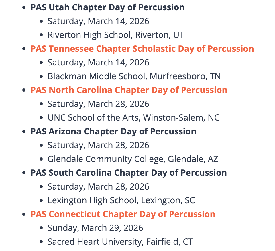 There are day of percussion events around the USA for the month of March. Friend of the show, Elena Bonomo will be giving a clinic at the Utah Day of Percussion on Saturday March 14th. Also, the CT Day of Percussion has moved location from Sacred Heart in Fairfield to Naugatuck High School in Naugatuck.