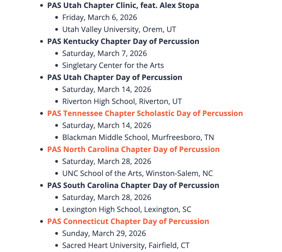 There are several days of percussion coming up in the month of March. You can get more info from the Percussive Arts Society’s chapter page.